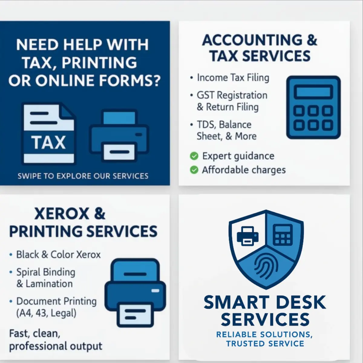 At SmartDesk Services, we believe in combining expert knowledge with personalized attention to help clients make informed decisions, ensure compliance, and achieve sustainable growth. Whether you’re a small business owner or a corporate professional, we deliver trusted guidance and accurate solutions — all under one desk.